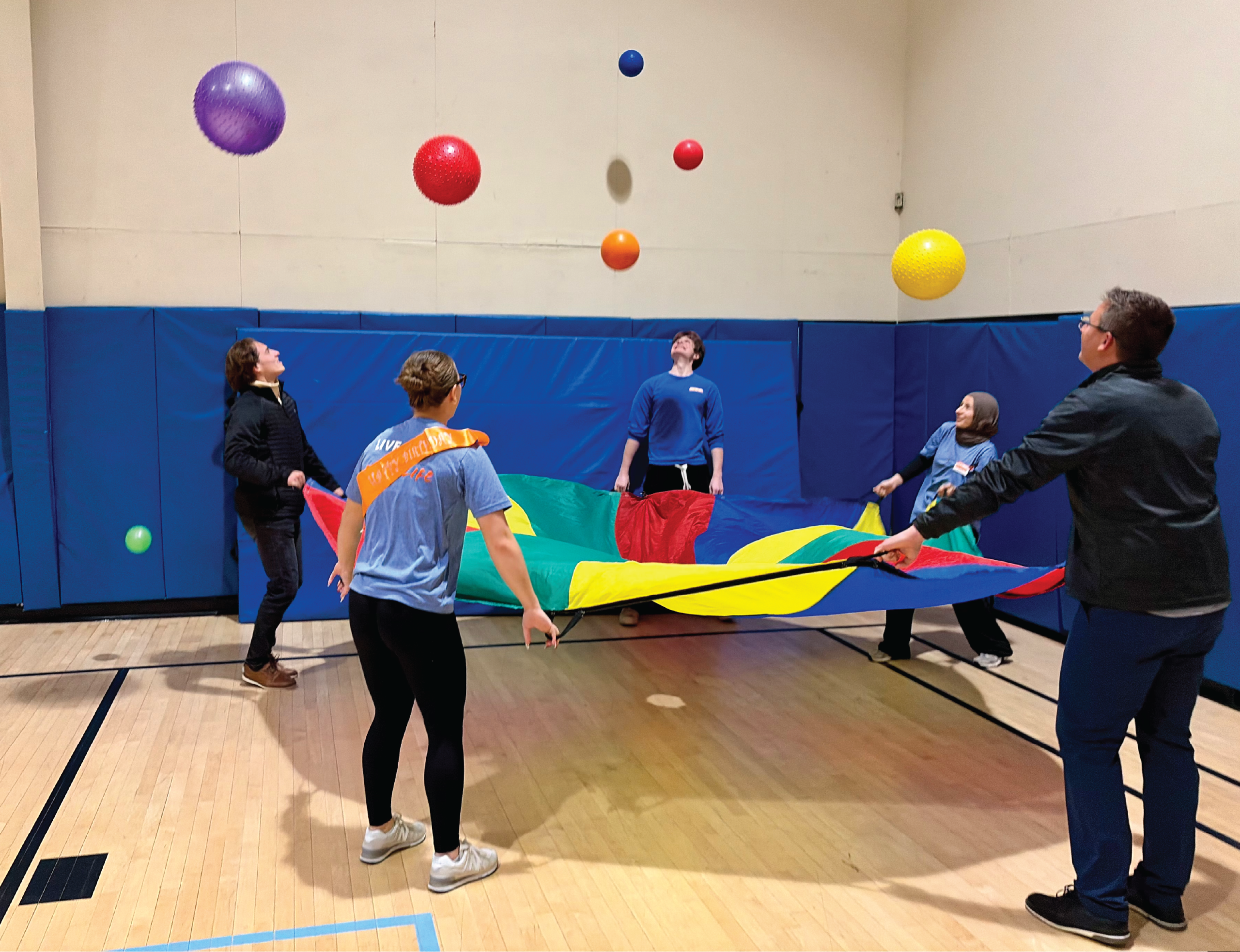 Join us for high-energy fun in the gym with obstacle courses, gymnastics mats, ramps, floor scooters, and colorful parachute games!